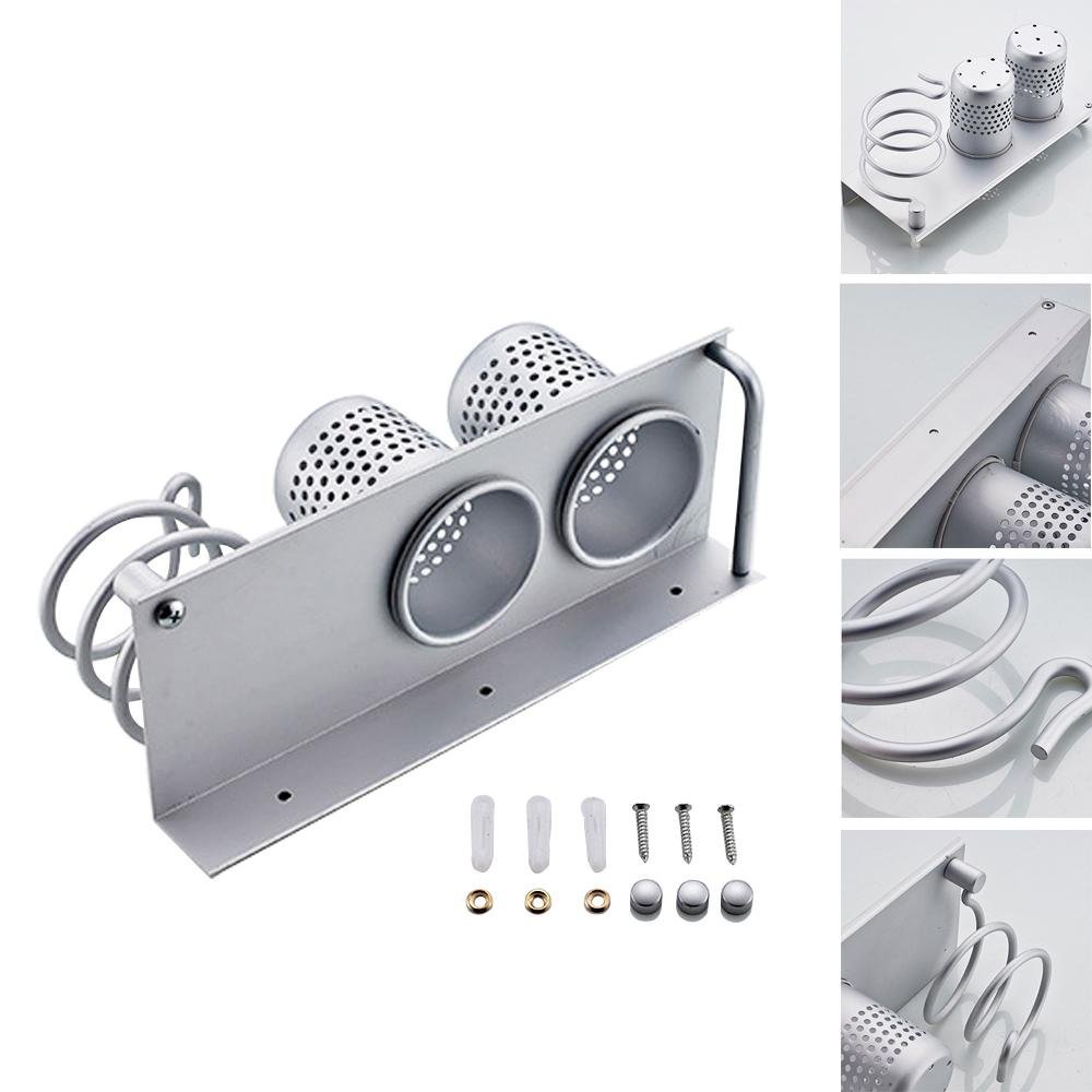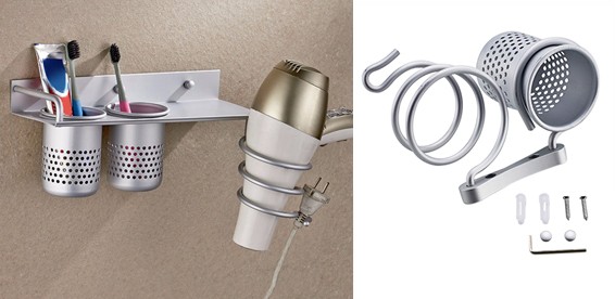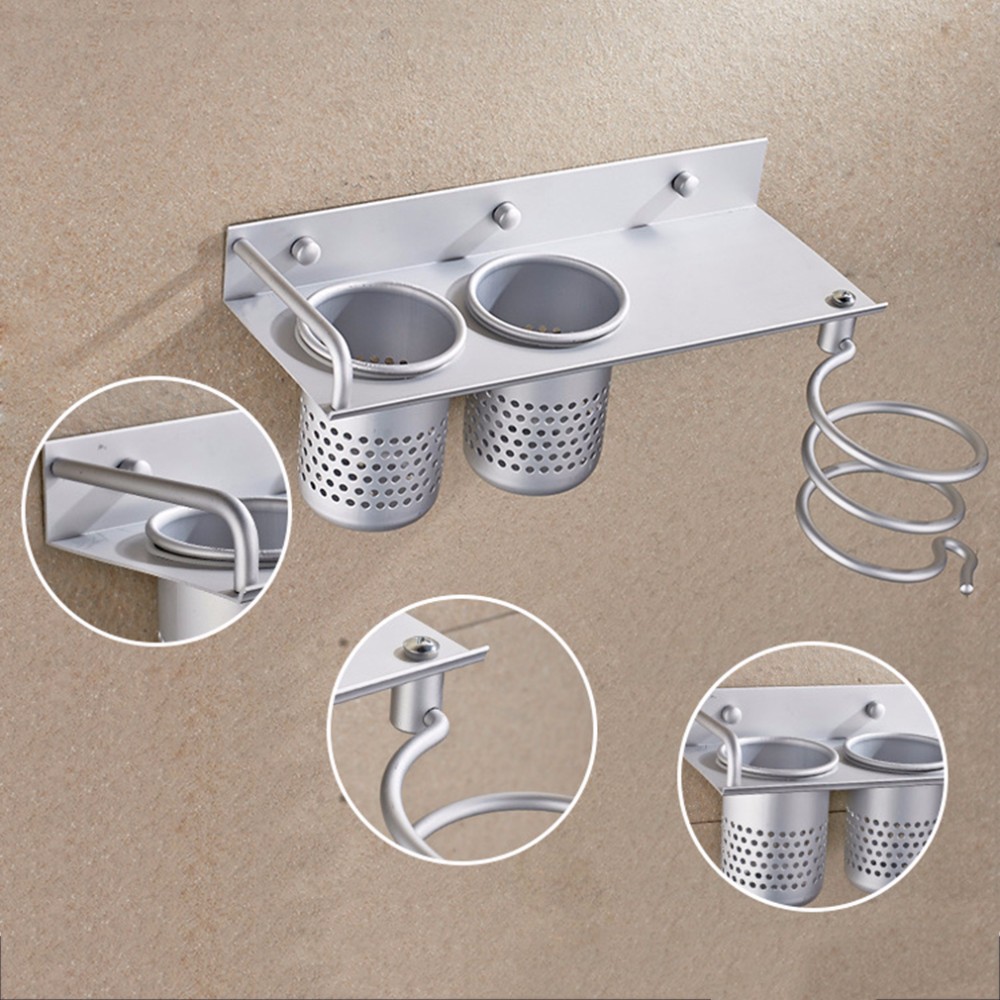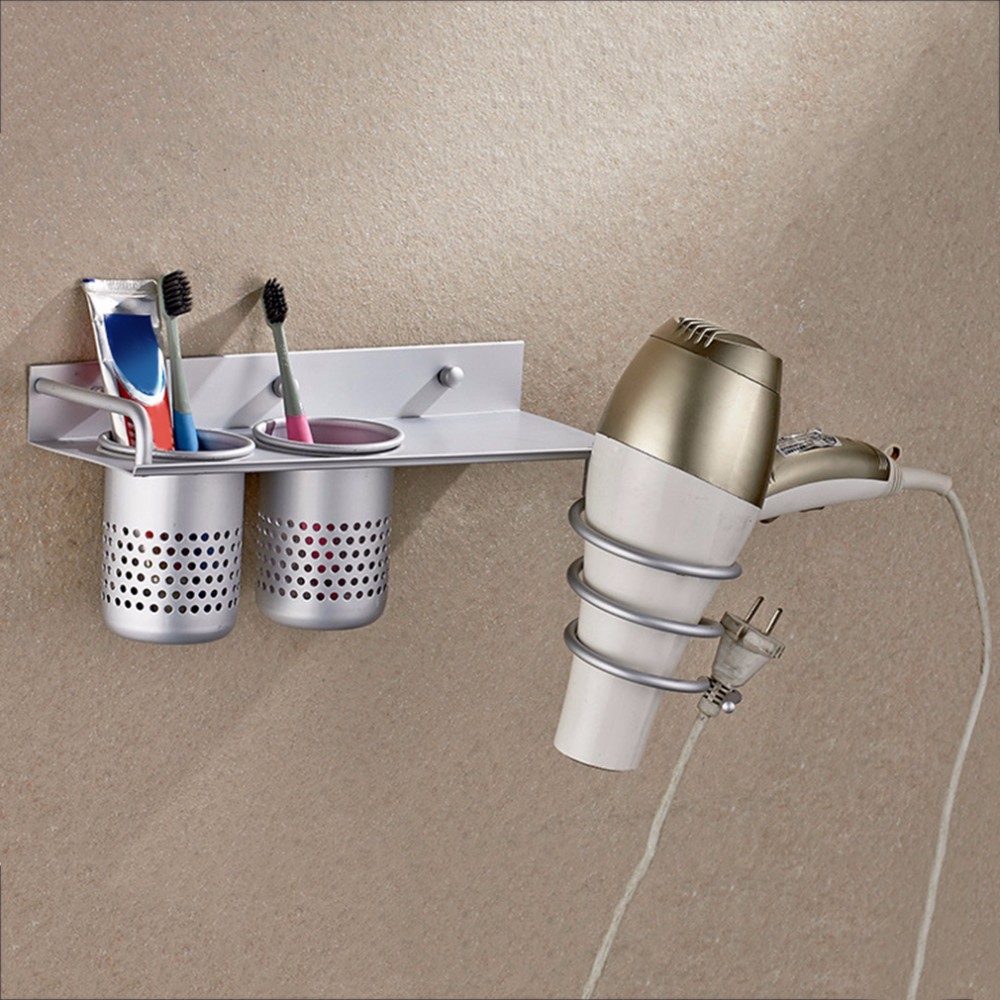 Держатель имеет два стакана, дополнительную площадку для хранения и специальное отделение для фена. Материал: алюминий. Размер: 29х12х14 см (ДхШхВ).