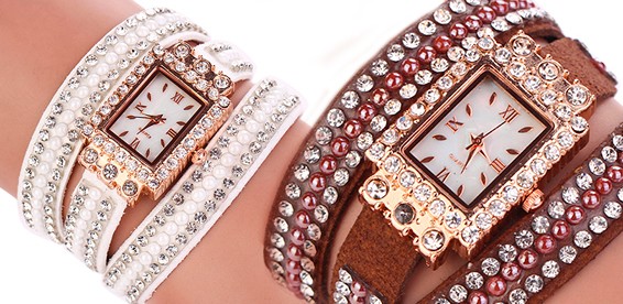 Полет дизайнерской фантазии не ограничивается никакими рамками. Яркий аксессуар - женские часы разных цветов. Браслет часов замшевый украшенный стразами. Они подчеркивают нежность запястья и хрупкость кисти.
