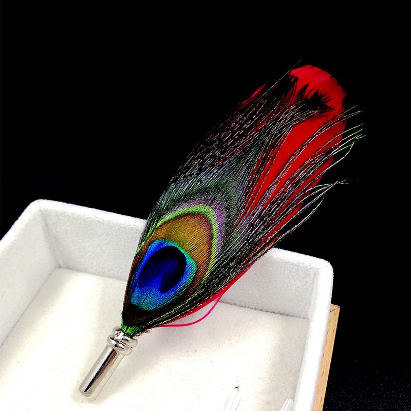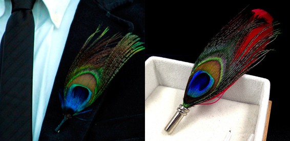 Маленькая скромная бутоньерка с павлиньим перышком придаст некой экзотики строгому праздничному наряду.