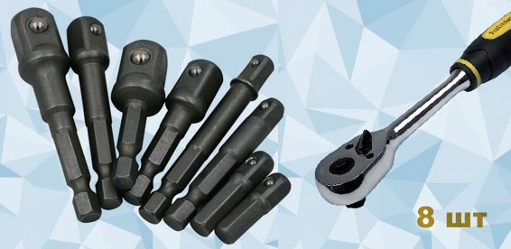 Набор адаптеров (8 шт.) Применяется для торцевых головок. Адаптеры изготовлены из хром-ванадиевой стали и имеют шариковый фиксатор для надежного крепления головки.