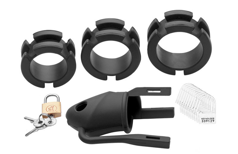 В комплект входят клетка на пенис, 3 утягивающих колеца разного размера для фиксации пениса и мошонки, набор для крепления и фиксации всей конструкции, замок с тремя ключами.