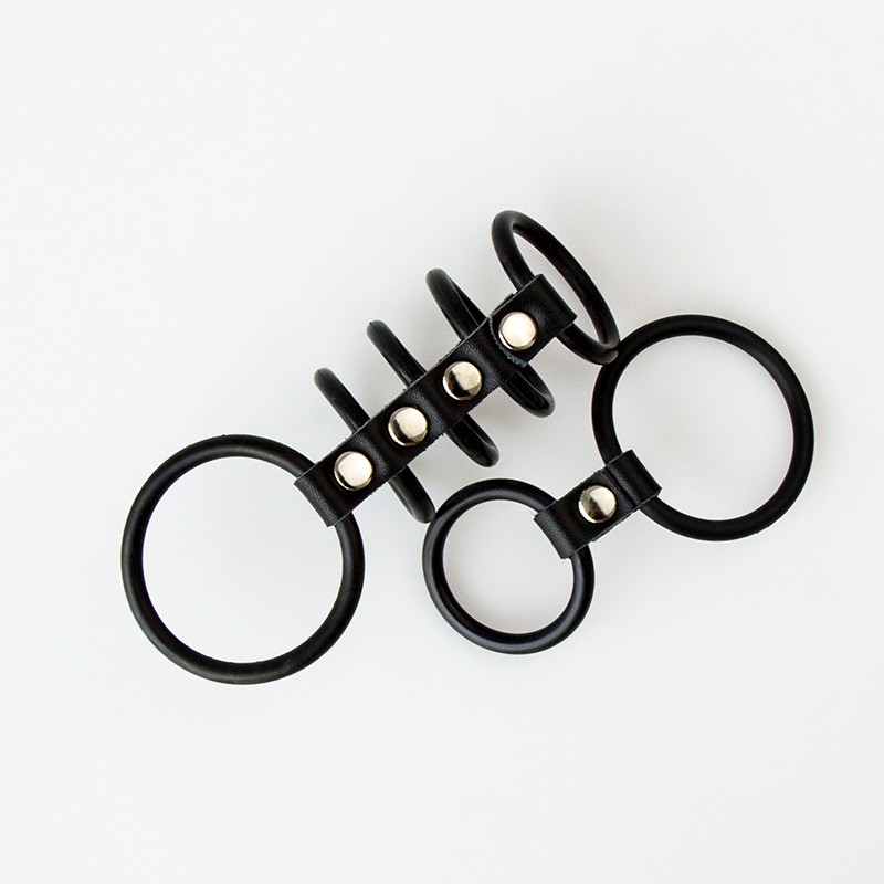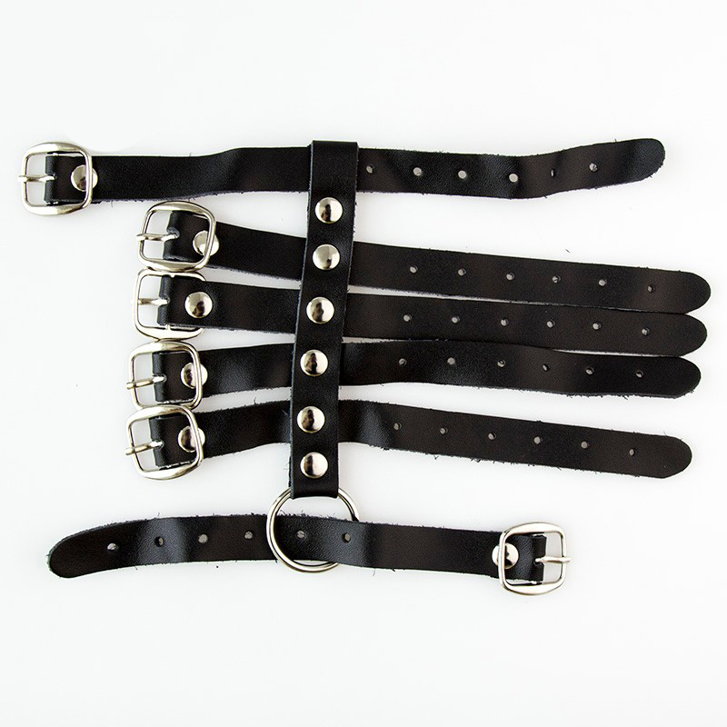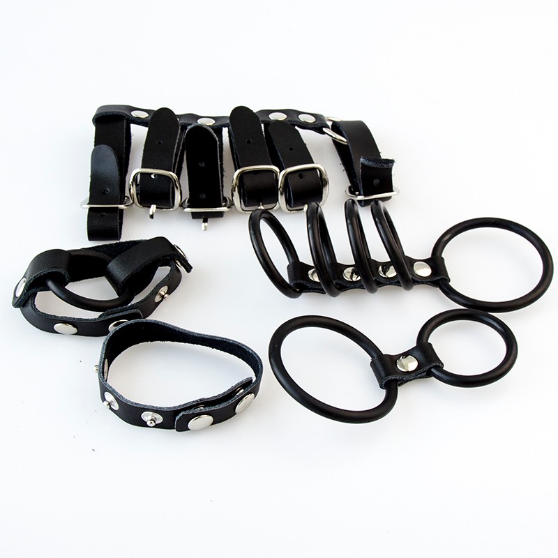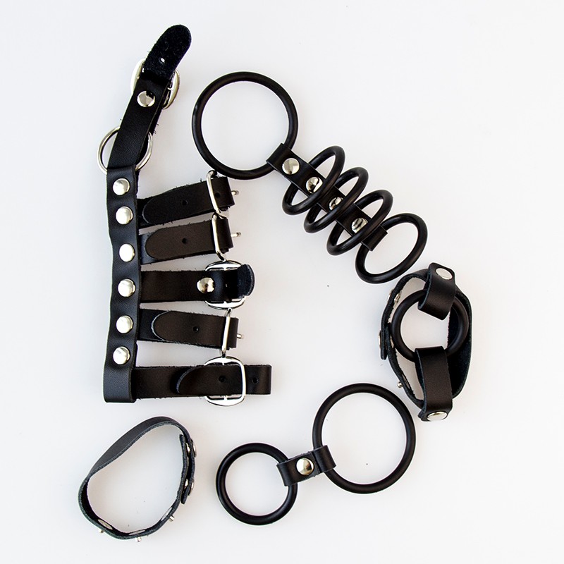 Сбруя выполнена из кожи и дополнена 5-тью эрекционными кольцами разных размеров, позволяющих расшить варианты использования фетиш изделия.