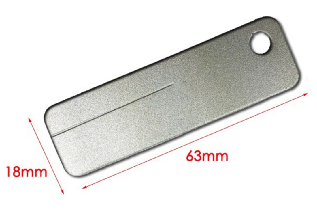 Комплектация — пластина и цепочка. На точилке есть отверстие, которое позволяет носить ее разными способами, помимо стандартного ношения на цепочке, например как брелок для ключей.