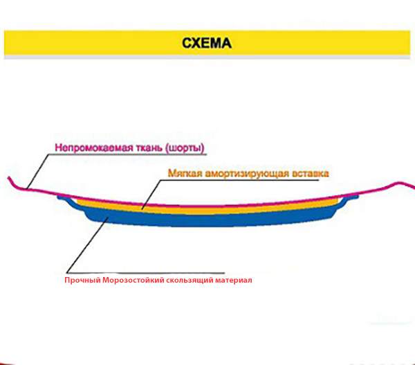 Ткань водонепроницаема, между тканью и ледянкой мягкая подкладка, защищает ребенка от холода, встрясок и неровностей на горке;