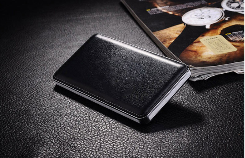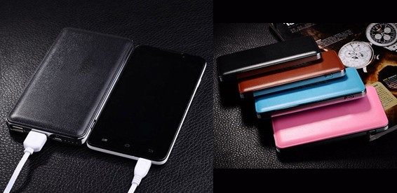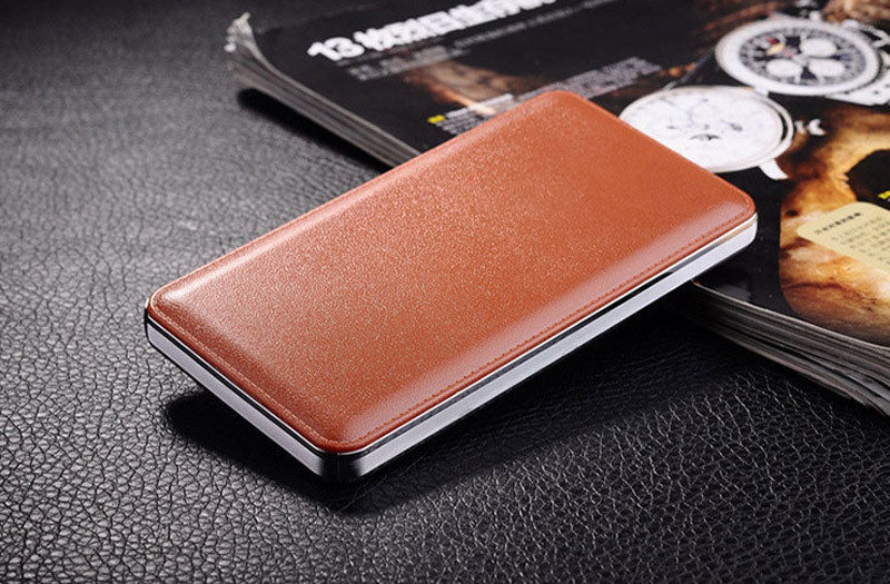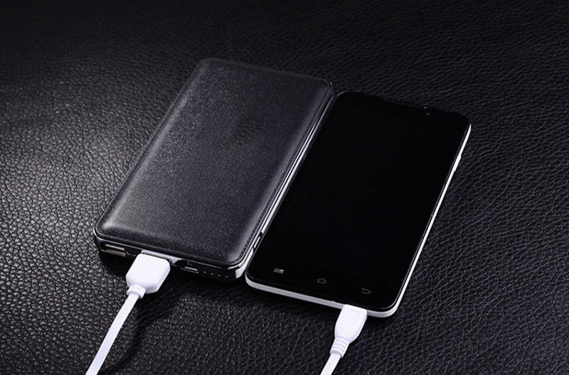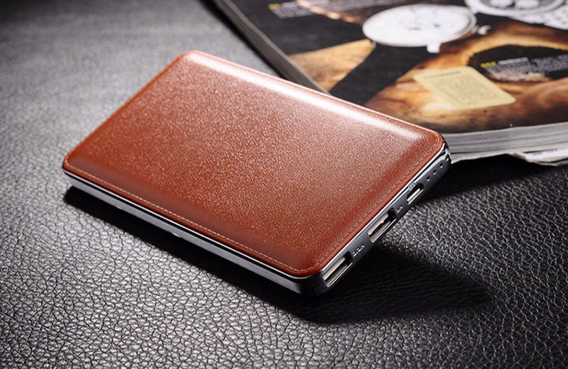 Компактный Powerbank на 12 000 мАч стилизованный под кожаный бумажник с двумя портами USB и индикатор питания.