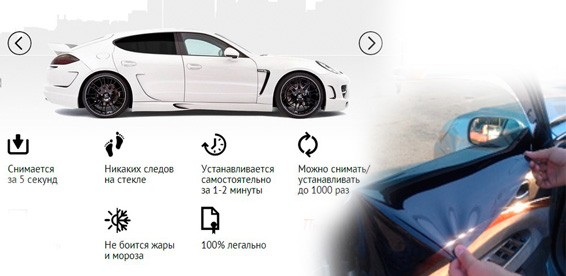 Съемная многоразовая тонировка абсолютно легальна и разрешена действующим законодательством. Она избавит вас от любых проблем с органами ГИБДД и позволит передвигаться на любимом авто в комфорте и приватной обстановке. Это отличный подарок для любого автомобилиста, который одинаково актуален как в крупных городах, так и за пределами населенных пунктов. Качественный и ходовой товар, настоящий хит продаж!