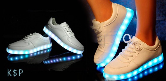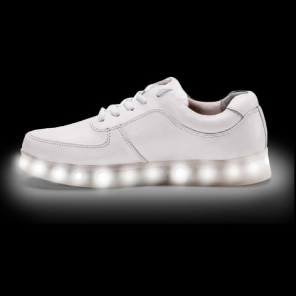 Светящиеся кроссовки K$P – классические белые кроссовки на толстой светящейся подошве. Имеют кнопку включения и выключения мигания, 7 цветов свечения подошвы, 3 режима мигания - смены цветов, шнур для USB зарядки в комплекте. Кроссовки изготовлены из современной искусственной эко-кожи с мягкой текстильной подкладкой и оснащены яркой светодиодной подошвой.