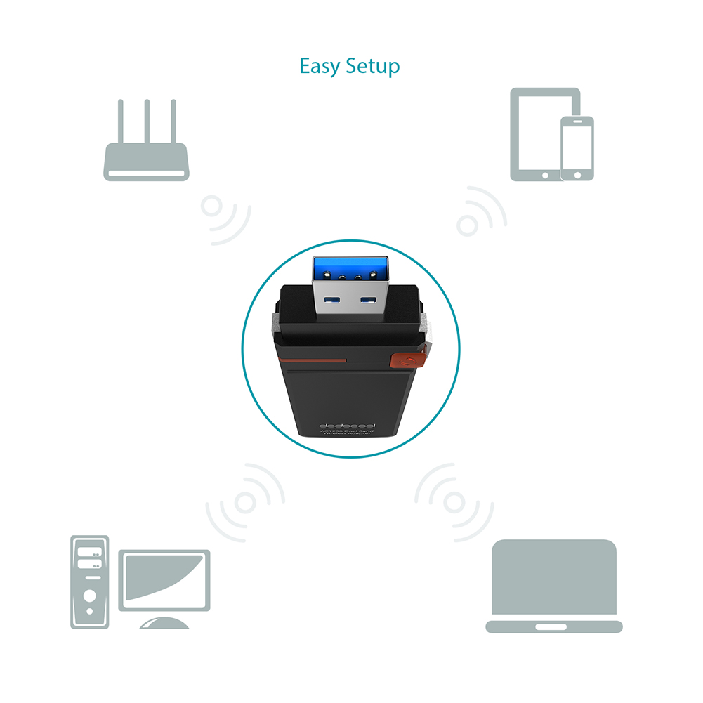 После установки драйвера устройства, подключить настольный компьютер или ноутбук к беспроводной сети через USB 3.0 или USB 2.0 порт. Он поддерживает функцию soft AP для сетевого доступа и может даже создать точку доступа Wi-Fi для мобильных устройств.