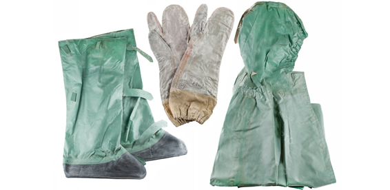Костюм изолирующий химический – предназначен для защиты от воздействия газообразной и жидкой фазы (брызги) хлора, аммиака, газообразной и жидкой фазы (облив) окислов азота, производных гидразина и других АХОВ при проведении аварийно-спасательных работ. Костюм состоит из герметичного прорезиненного комбинезона с притачным капюшоном, брезентовые трехпалые рукавицы, прорезиненные сапоги. В области спины втачивается рюкзак для размещения в подкостюмном пространстве дыхательного аппарата и баллонов со сжатым воздухом.