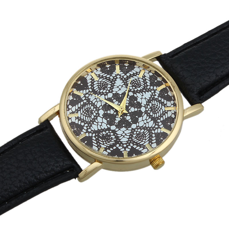 Наручные часы оснащены кварцевым механизмом с часовой, минутной и секундной стрелками. Ремешок выполнен из PU кожи чёрного, белого, коричневого и бежевого цвета, корпус изготовлен из стали с золотистым покрытием. Циферблат оформлен изображением кружева.