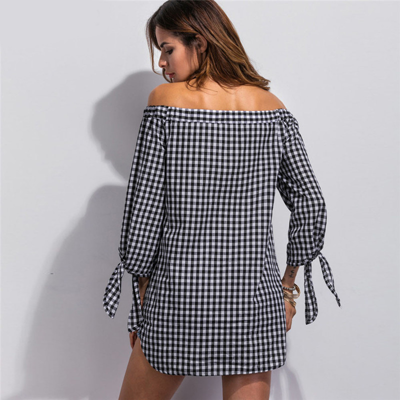 Платье укороченное, с объемными рукавами три четверти и открытыми плечами. Фасон платья свободный, что позволяет скрыть мелкие недостатки фигуры. Платье можно носить как с однотонными леггинсами или шортами, так и с зауженными брюками.