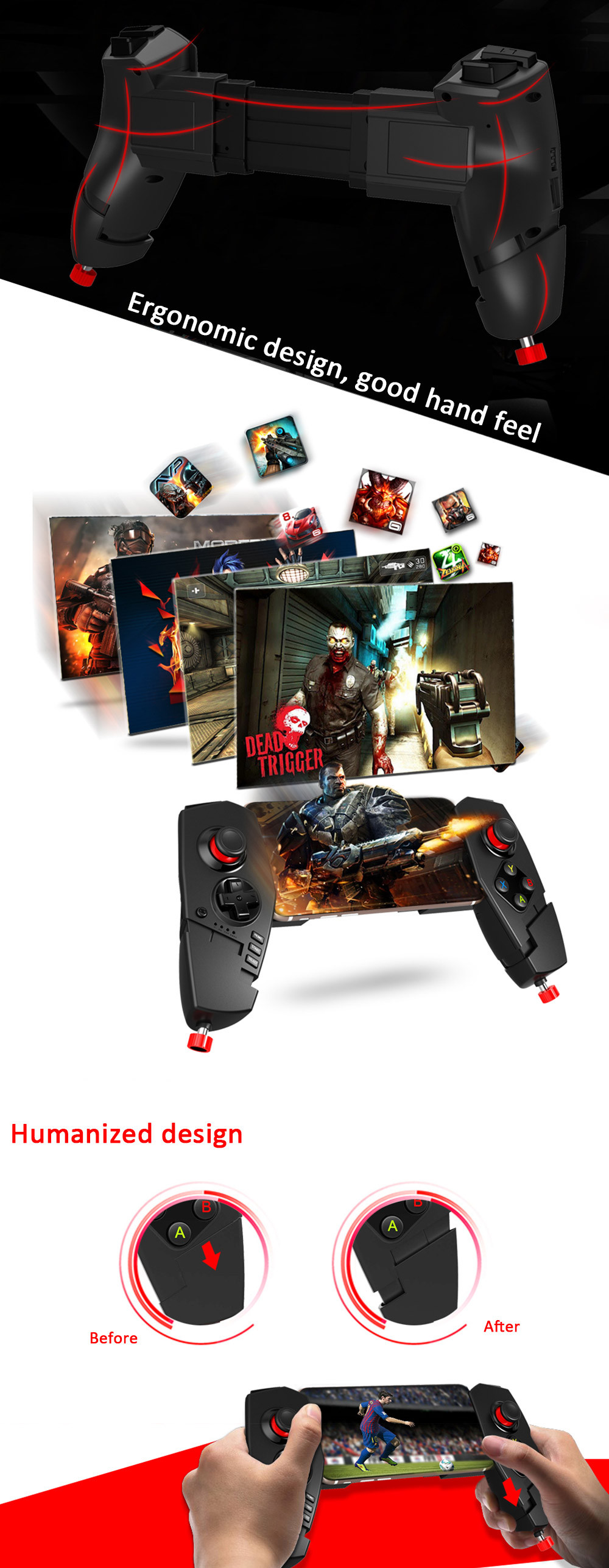 Новый стильный полнофункциональный джойстик для Android от компании iPega с кодовым названием Red Spider. Контроллер поддерживает устройства на Android, iOS в режиме iCade и Windows. Корпус сделан из добротного софт тач пластика, геймпад удобно располагается в руках. Для улучшенния эргономики есть функция удлинения рукояток с помощью специальных регуляторов. Телескопическое крепление вместит устройство в горизонтальном положении с диагональю экрана до 6 дюймов. Отдельный переключатель для основных режимов сопряжения (Android и iOS). Есть функция проверки уровня заряда встроенного аккумулятора, путем отображения диодов в виде шкалы.