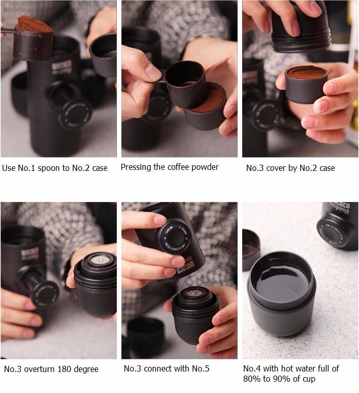 Портативная дорожная кофемашина, не требует электричества и создает давление до 9 атмосфер для приготовления кофе, благодаря встроенному ручному насосу. Принцип работы напоминает эспандер, который выдвигается из кофемашины, далее пару движений рукой и кофе готово. Карманная кофемашина имеет внутри емкость для 1 чашки горячей воды 69мл (для кипятка) и порции молотого кофе. В роли чашки выступает крышка колбы. Заправлять устройство разрешается кофейными капсулами и даже обычным молотым кофе.