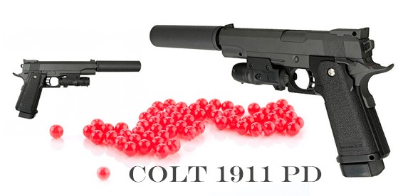 Самая покупаемая модель!!! Она не только повторяет дизайн американского Colt 1911 PD, но и оснащена глушителем и лазерным прицелом, что делает ее абсолютно реалистичной. Большой пистолет с массивной рукояткой. Корпус из цинкового сплава, вставки из ABS пластика. Курок стилизован под оригинал, плавно нажимается, палец не соскальзывает. Глушитель из легкого пластика не утяжеляет пистолет. Лазерный прицел работает от 3 батареек L1131 (в комплект входят), которые спрятаны под съемной панелькой. Он крепится на ствол с помощью отвертки и винтов. Обойма из пластика с тугой пружиной легко заполняется 18 пульками диаметром 6 мм. Лучший подарок мужчине любого возраста. Самостоятельная сборка. Мощность и скорость подходят для активного страйкбола.