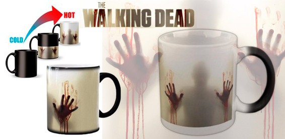 Керамическая кружка хамелеон ходячие мертвецы "The Walking Dead". Изменяет цвет при нагреве. В холодном состоянии кружка черного цвета Если в нее налить горячий напиток, то наружная часть меняет цвет с темного на светлый, а на светлом поле проявляется рисунок.