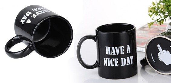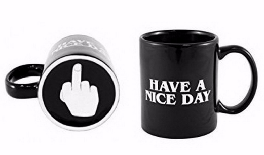 Пожелание вполне милое и приятное, конечно. Пусть у вас будет хороший день. И только красноречивый рисунок снаружи на дне чашки намекает, что это не банальная вежливость, а невероятно ядовитый ироничный посыл. Ну конечно, плохое настроение — не повод быть грубым. Пусть все за вас скажет кружка.