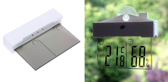 Прозрачный уличный термометр — в то же время домашний градусник, который может показывать температуру в цельсиях и фаренгейтах. Его можно прикреплять на окно, как внутри так и снаружи. Работает от пальчиковой батарейки.