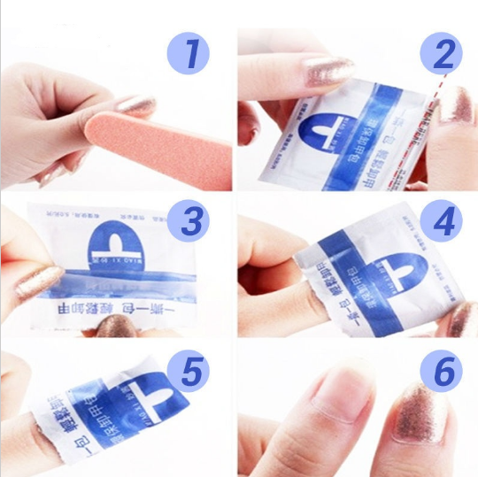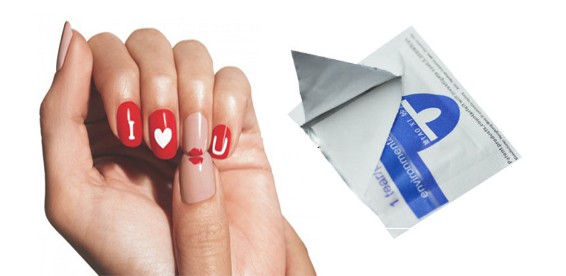 Одним из вариантов снятия являются специальные готовые пластыри пропитанные специальным составом. Для применения подобного способа достаточно просто раскрыть пластырь прикрепить к ногтевой пластине, аккуратно обернув его вокруг пальца. Время ожидания: 10-15 минут.