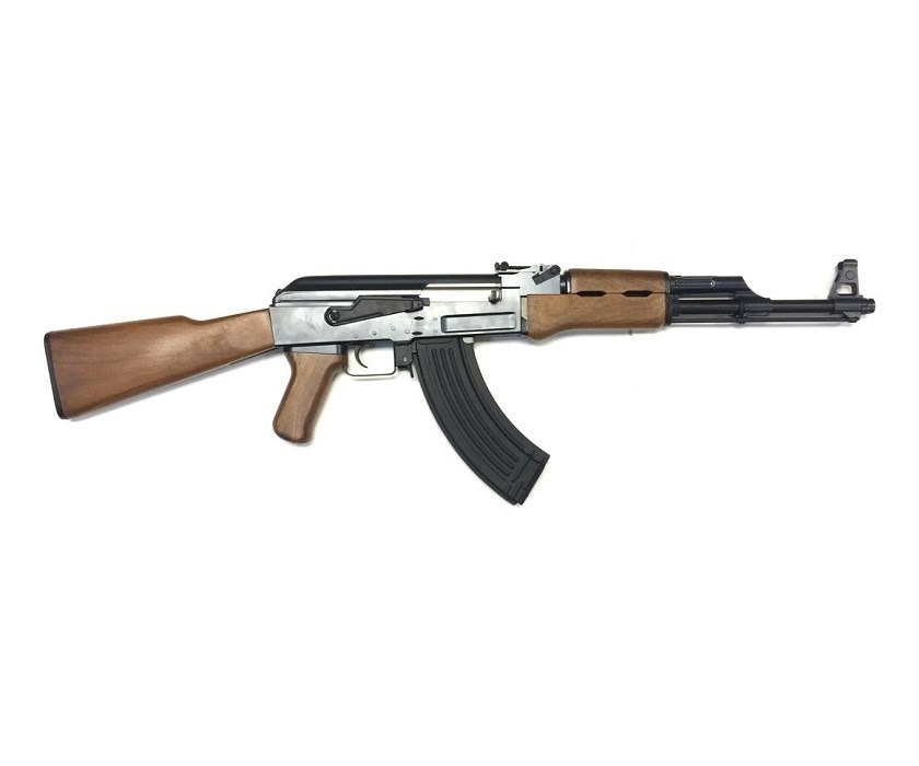 Версия страйкбольного автомата АК 47 также относится к распространенным моделям среди электрических изделий. Отмечается качественное выполнение, а также максимальное подобие оригиналу, что создает высокий спрос на продукцию. В нем множество деталей из металла. В магазине способно поместиться 600 шаров, вес – 3070 грамм. Аккумуляторный источник энергии, а эффективная дальность составляет 55 м. Параметры темпа стрельбы – 880 BBs/min. В модели для страйкбола используется двухрежимный огонь, можно стрелять очередью или одиночными. AEG электропневматический тип.
