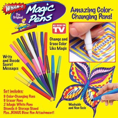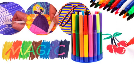 Волшебные фломастеры Magic Pens – набор состоит из 18 цветных фломастеров и 2-х фломастеров белого цвета, которые используются в качестве проявителя для изменения цвета. Корпус выкрашен в цвет, который отображает конкретный фломастер, колпачок же имеет тот оттенок, который должен появиться после использования проявителя.