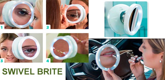 Зеркало с увеличением и подсветкой Swivel Brite – увеличительное зеркало с LED-подсветкой необходимая вещь в доме для женщин и мужчин. Поможет качественно провести любые косметические процедуры. С ним гораздо удобнее наносить макияж, избавляться от нежелательных волос, надевать контактные линзы. Зеркало с увеличением и подсветкой можно брать с собой куда угодно. После отсоединения от подставки, миниатюрное зеркало помещается, практически, в любую женскую сумочку.