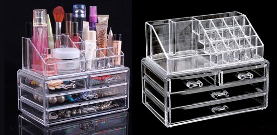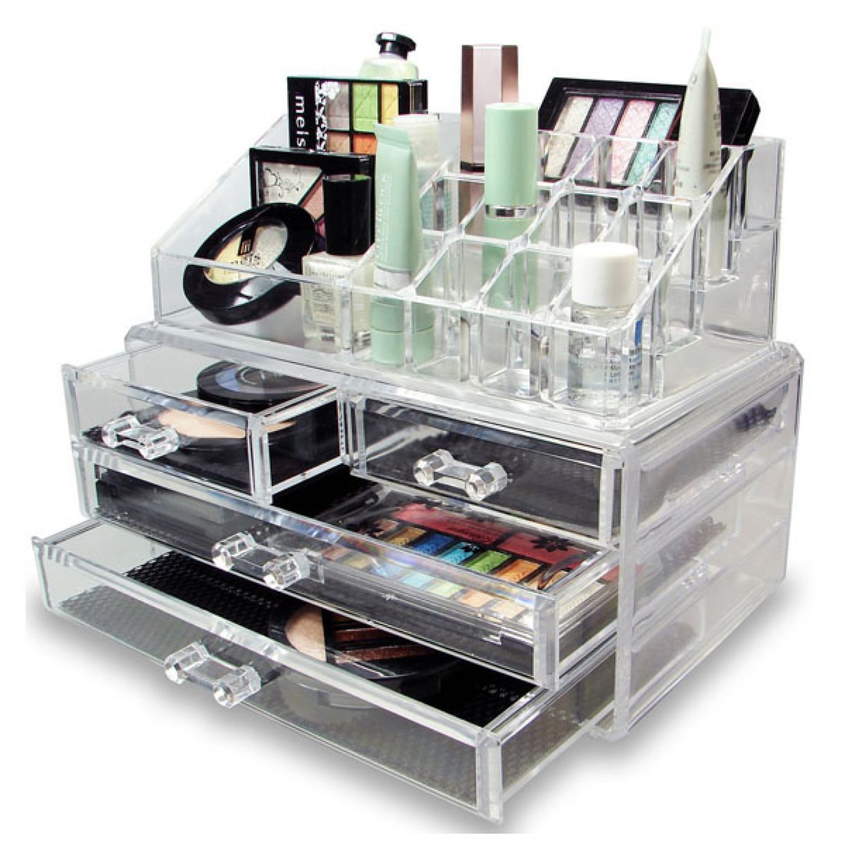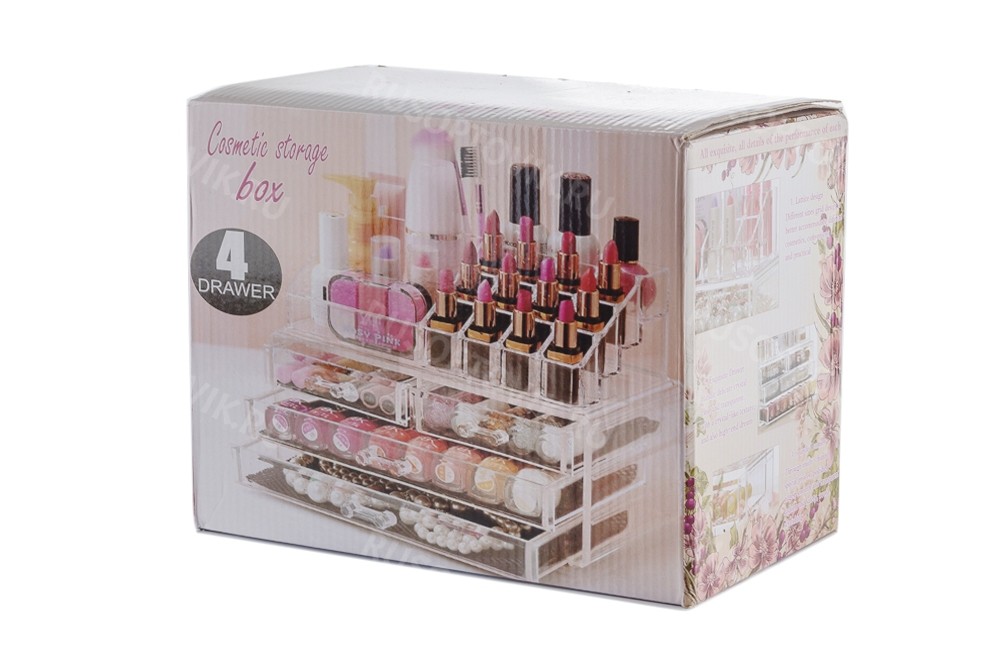 У каждой современной девушки много косметических средств и мало места для их хранения. Пластиковый двухуровневый органайзер вместит в себя косметики на 2-3 косметички. Нижний уровень состоит из 2 широких ящичков и 2-х узких. Верхний уровень состоит из 16 открытых вертикальных отсеков.
