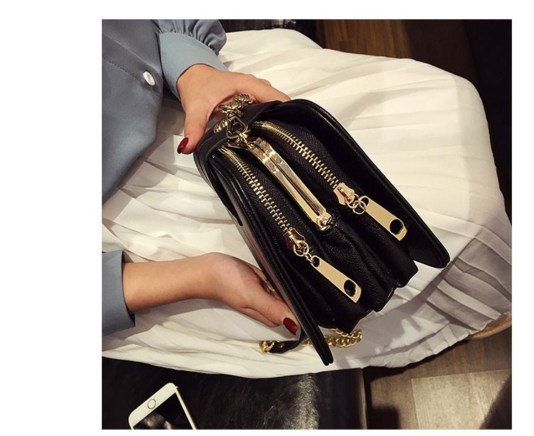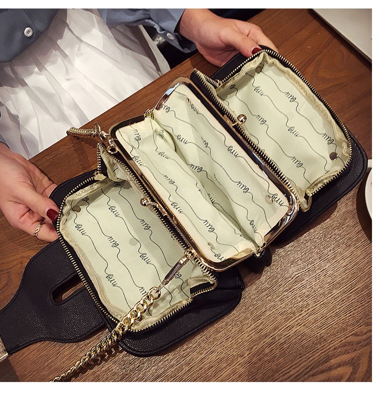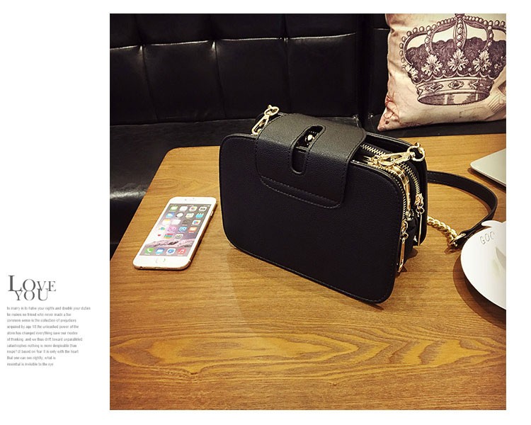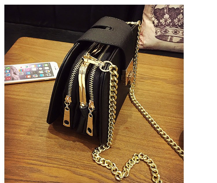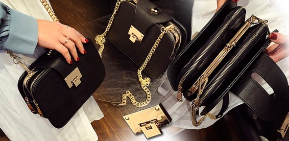 Удобная сумочка на цепочке с тремя отделениями и металлической пряжкой.