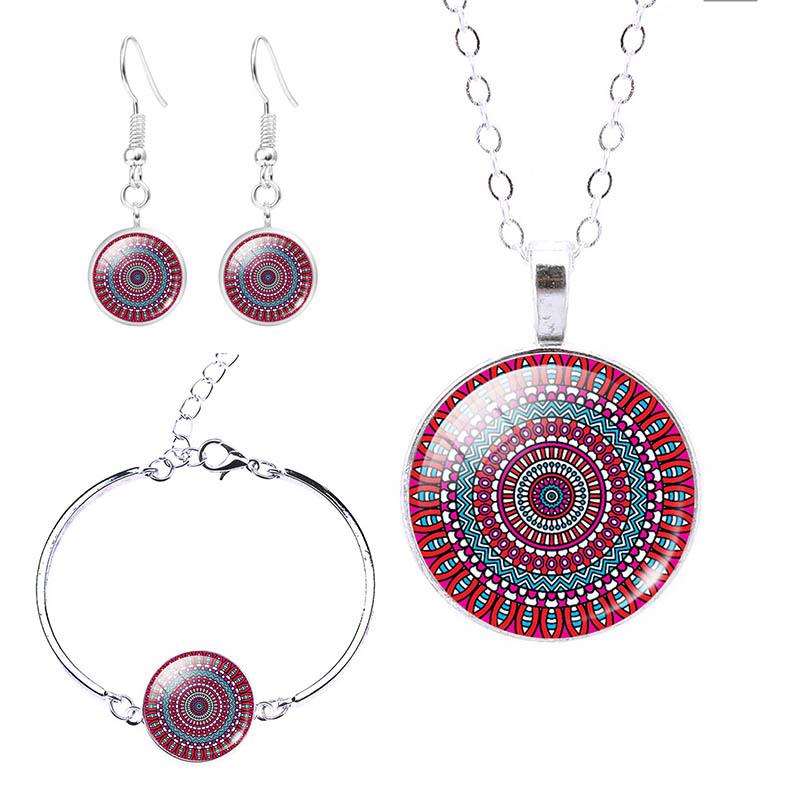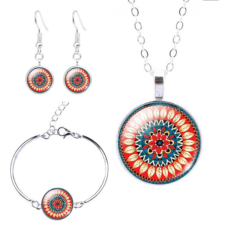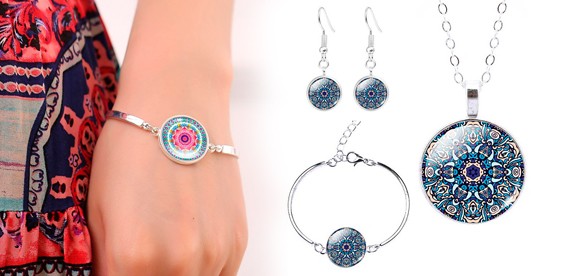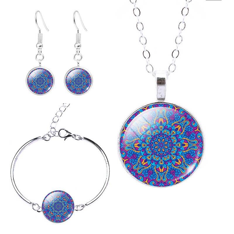 Набор с посеребренным покрытием, состоит из цепочки с кулоном, сережек-гвоздиков (или серьги крючком) и браслета с различными изображениями Мандалы - цветка жизни.