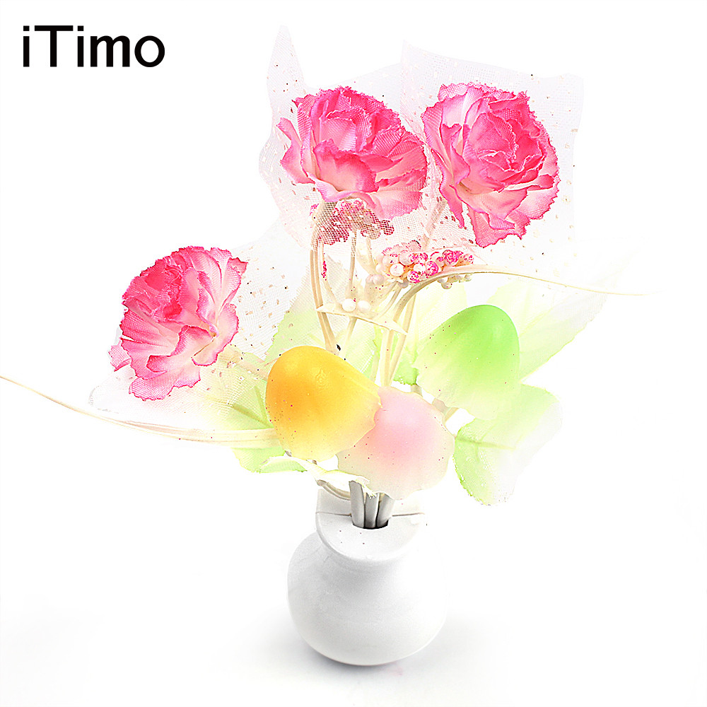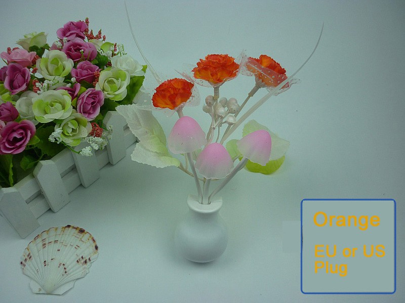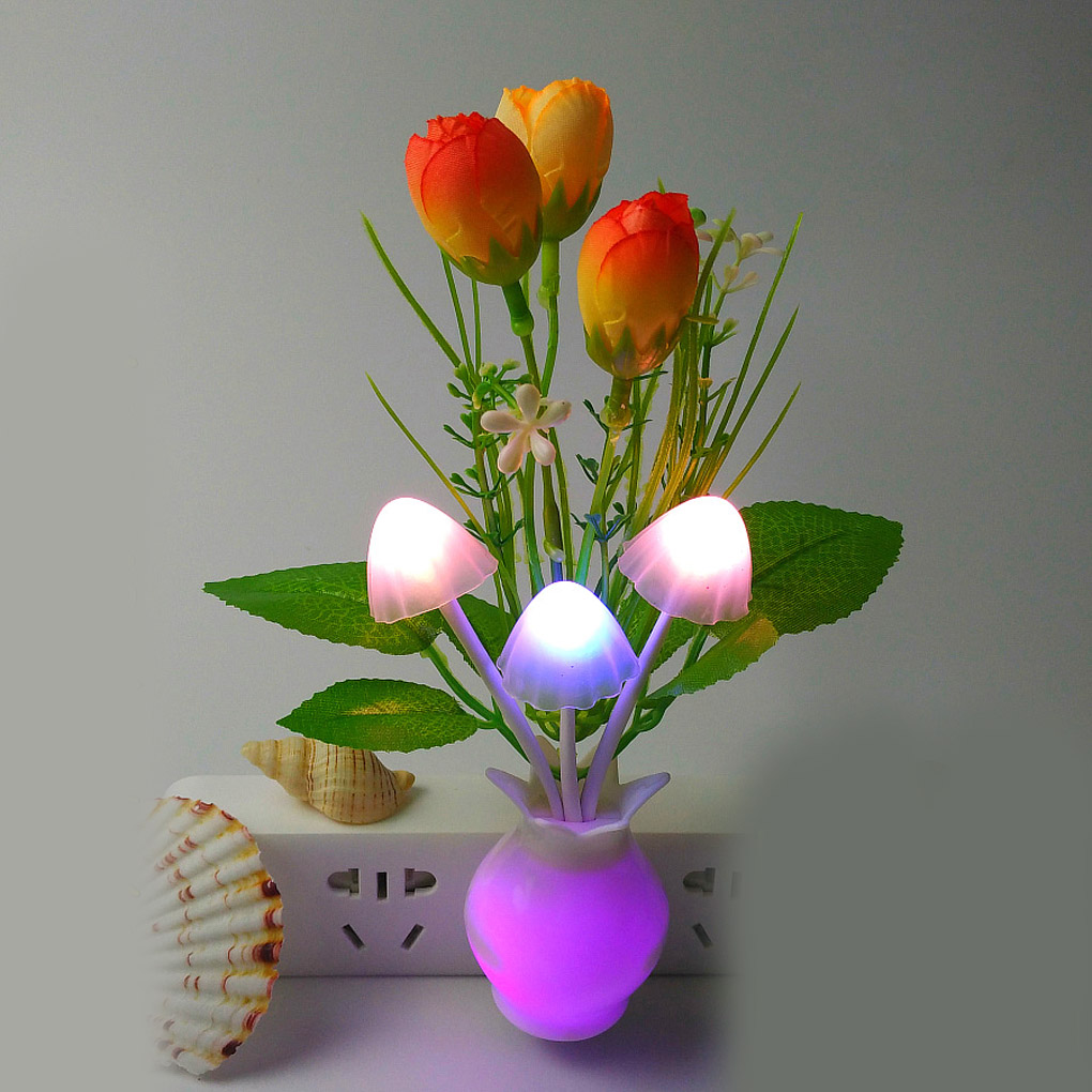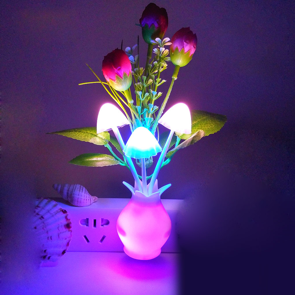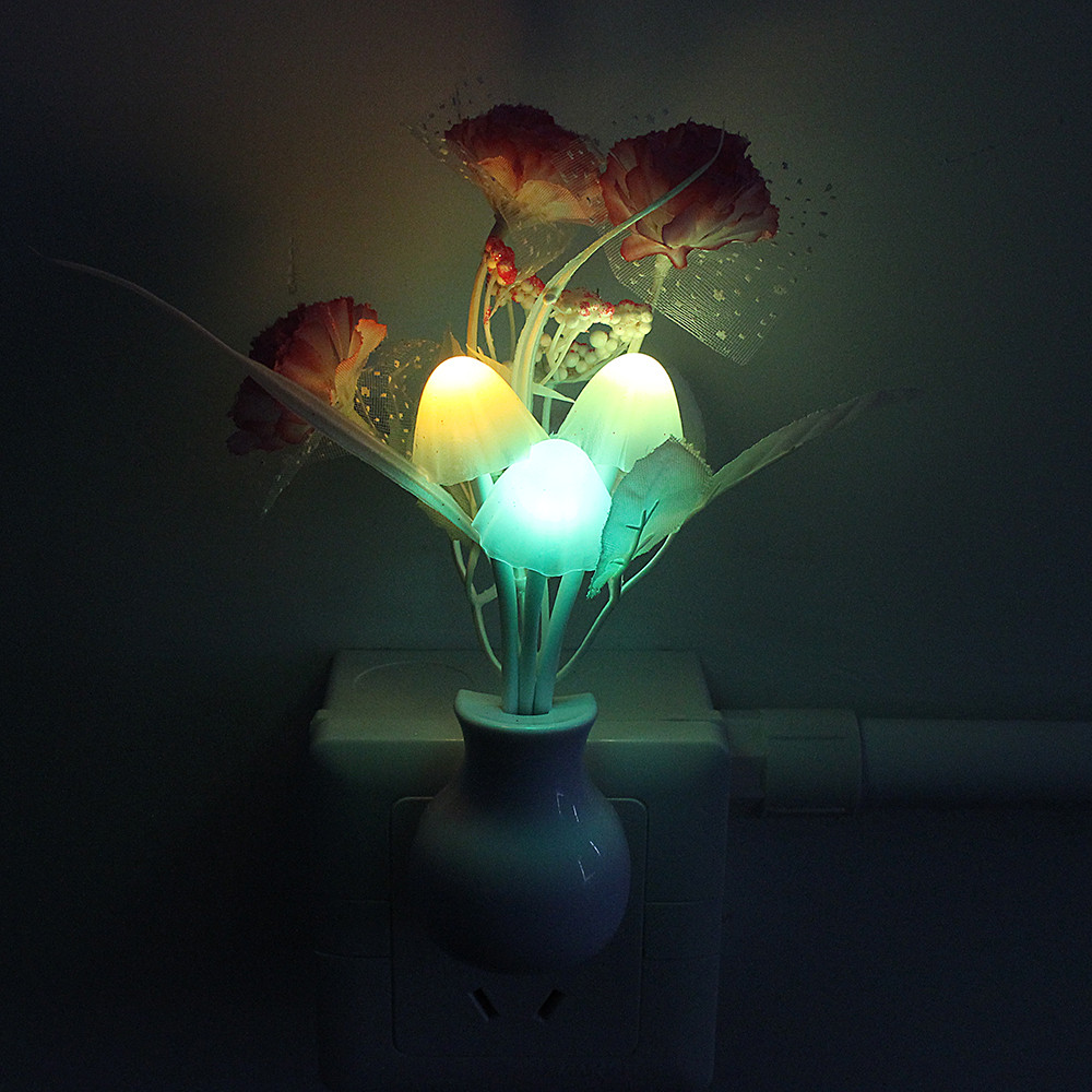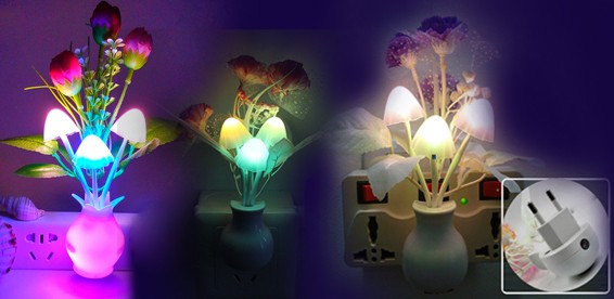 Маленький светильник-ночник с Алиэкспресс в виде вазочки с грибами и цветами. Работает от сети (включается в розетку). Имеет датчик освещения - при выключении света в помещении грибы горят огнями. Светодиоды многоцветные, поэтому грибы меняют цвет в темноте.