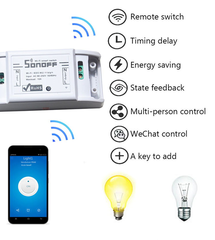 2. Sonoff , доступное устройство, которое поможет вам, войти в умный дом. Wi-Fi беспроводной переключатель, который может подключаться к устройству различных типов и брендов. Sonoff посылает данные на облачную платформу через Wi-Fi маршрутизатор, которая позволяет удаленно контролировать все приборы с приложением eWeLink на вашем смартфоне.