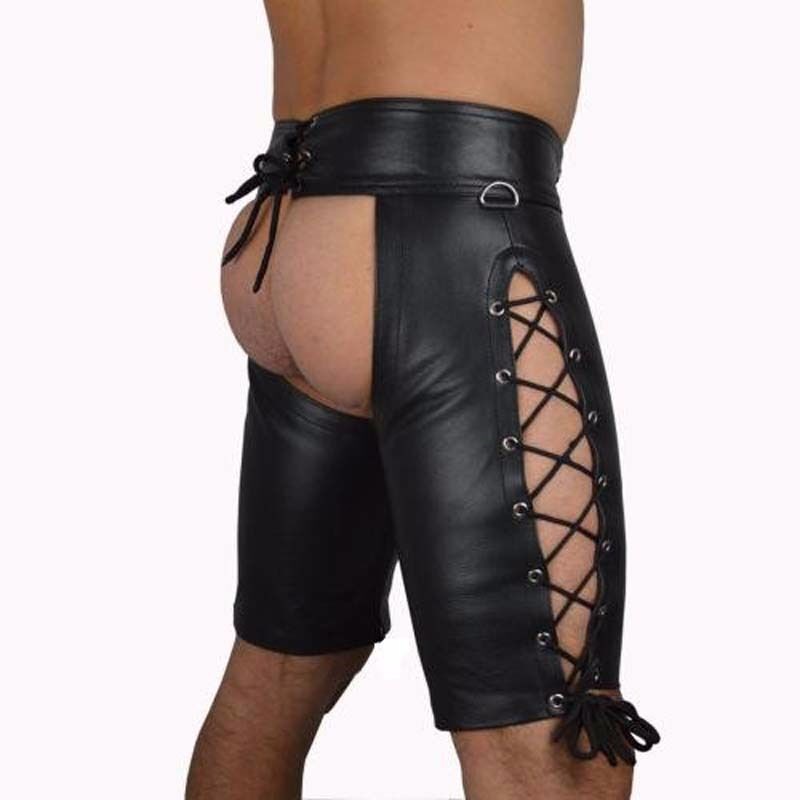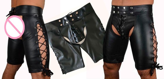 Мужские кожаные фетиш-шорты со шнуровкой и заклепками.